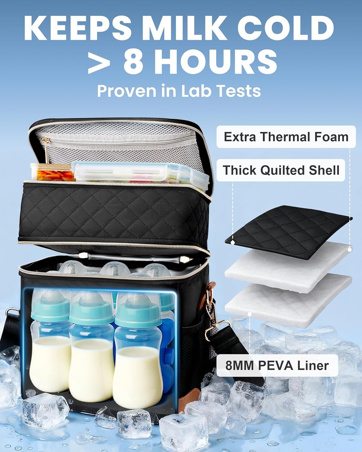 Superior Insulation with Ice Pack: 4-layer insulation with wear-resistant shell, thick EPE foam, and leakproof PEVA lining keeps milk fresh over 8 hours, even in hot weather.