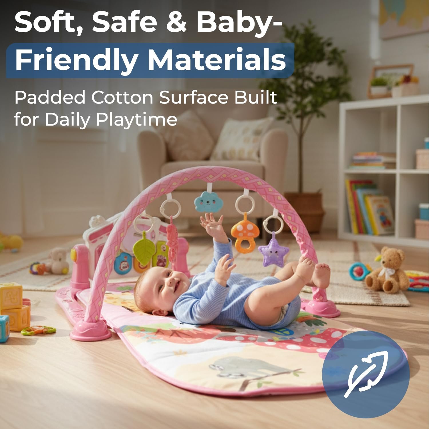 The plush, padded mat provides a cozy surface for extended playtime. Designed for everyday life with babies, the entire mat is machine-washable, making cleanup quick and easy for busy parents.